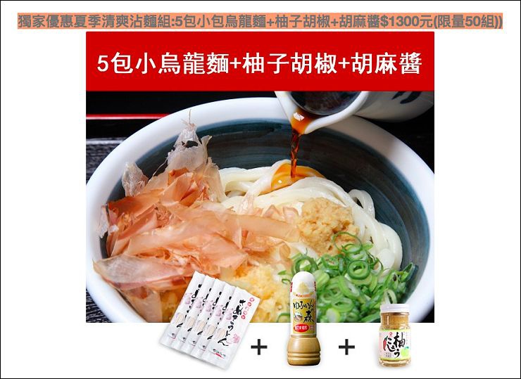 (5) 夏季清爽沾麵組「小包烏龍麵X5+胡麻醬+柚子胡椒」優惠價$1,300元---限量50組