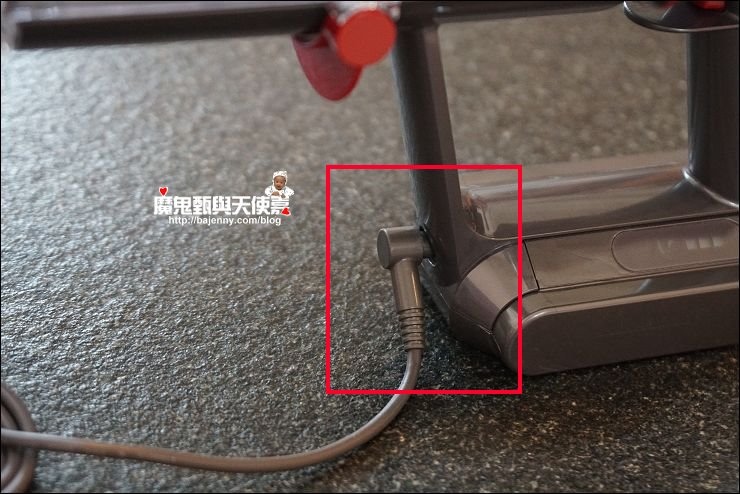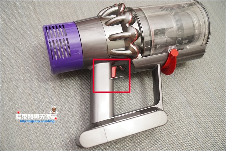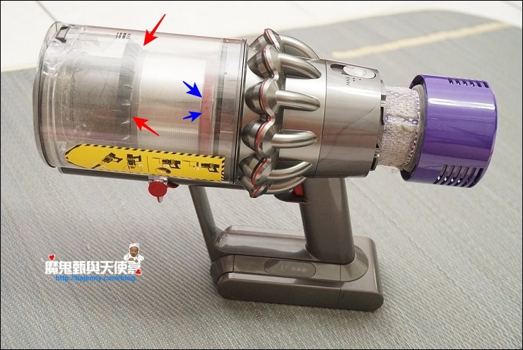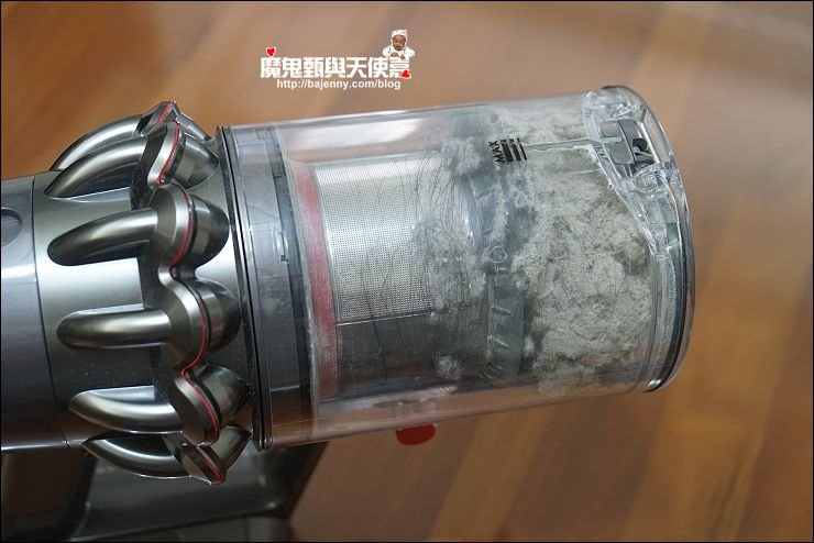 V10這次在集塵做了不少手腳,底部加了一個紅色的環,外層推下時內圈也同時刮下卡在集塵筒中心的灰塵和頭髮,中間段也添加了一個橡膠材質的圓裙,比較不會卡東西進去,雙層設計小巧思。