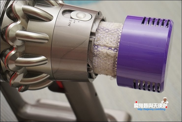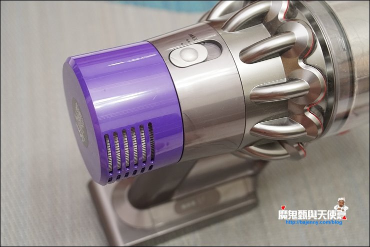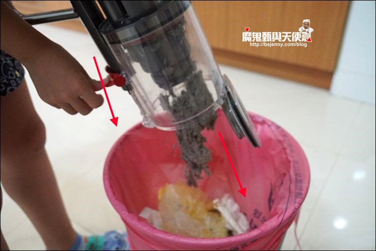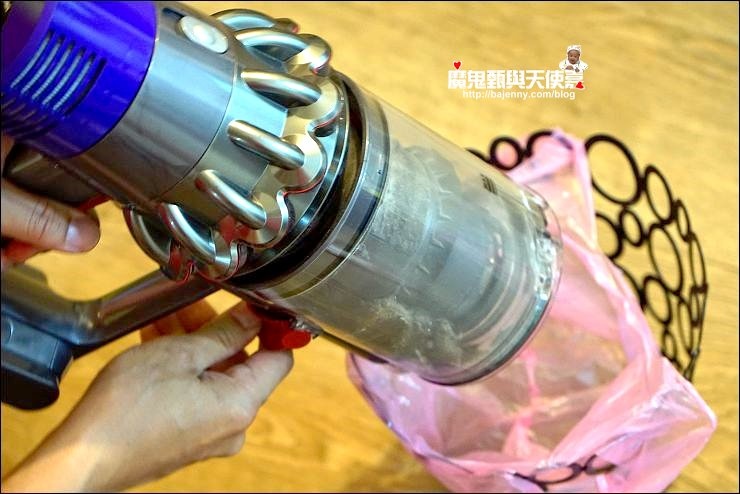 是說吸入所有髒東西後,清理步驟也很重要!才不會卡一堆東西影響馬達效能,V10將塵筒橫置,開蓋方式向前推出,整套動作順向一氣呵成,一鍵彈出,清理上更加方便,基本上只要準備大一點的塑膠袋即可(免得噴灑出來)。