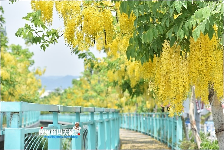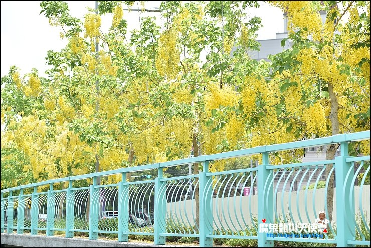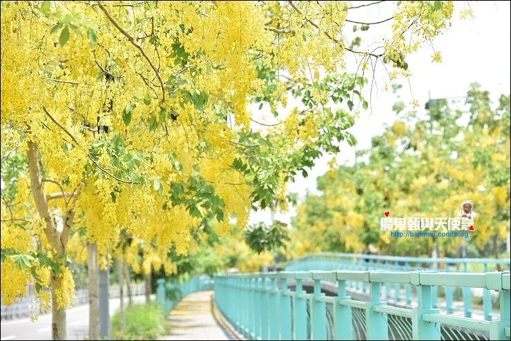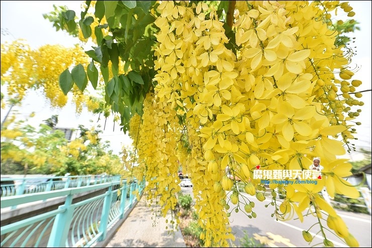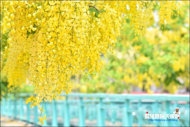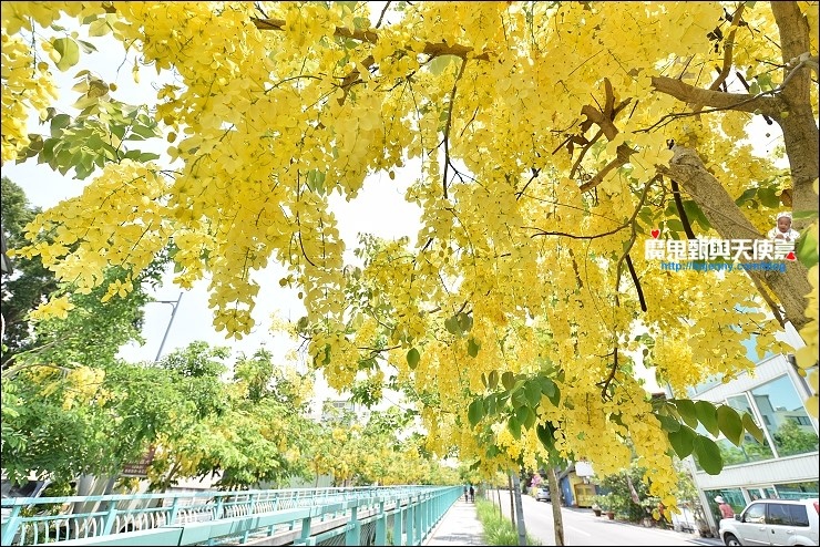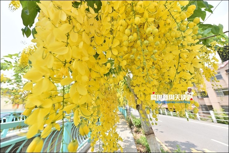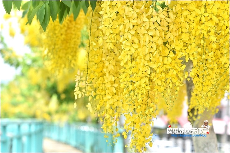 南投福崗路一段的阿勃勒目前滿開中,金黃花串搭配中間的帝芬妮藍還是湖水綠的欄杆感覺很好拍,所有花都集中在台3甲彰南路和台3線南崗二路之間(路口有間漢堡大師),這段路說長不長說短也不短,附近就有交流道交通方便也很好停車,不過整條路非常曬,請注意防曬和飲食補給。