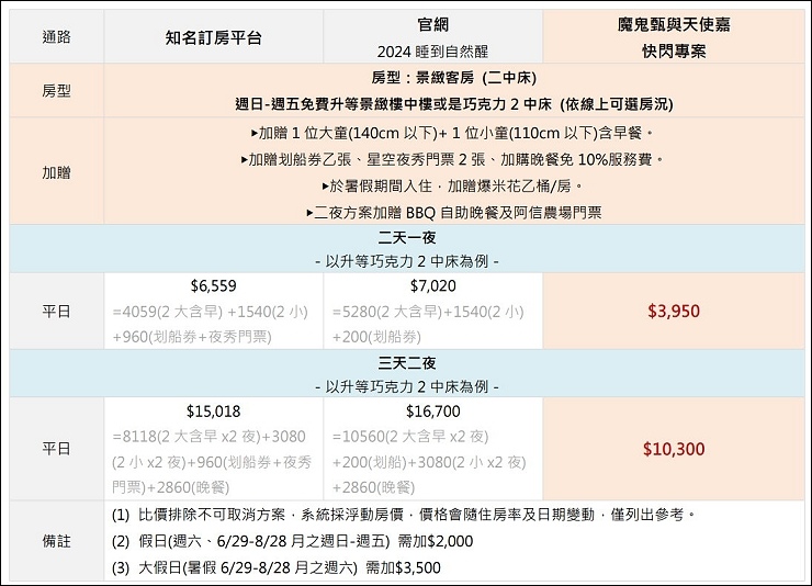 ▶加贈划船券乙張、星空夜秀門票2張、加購另一晚晚餐免10%服務費。