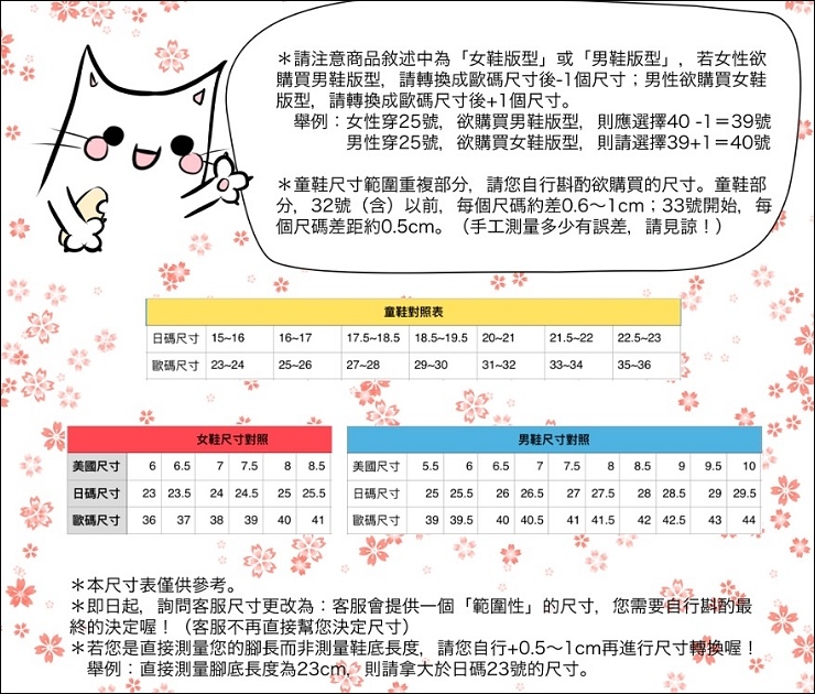 關於尺寸的問題要注意!!無需綁帶女生最大到42碼/男生最大到46碼(可選白色跟黑色當情侶鞋喔),平常穿37要加大變38,但是像我一樣喜歡穿寬寬的人就要order39,另外童鞋只有雙號跳,因為每碼只差0.5公分,34碼=22公分,看腳長多少對照,童鞋36是23公分,大人36也是23公分,這是國際碼對照,不會有差異,另外廠商提供ㄧ次免運費換尺寸的服務,會由他們派件收送替換,如第二次需加收費用來回運費160元。