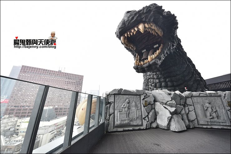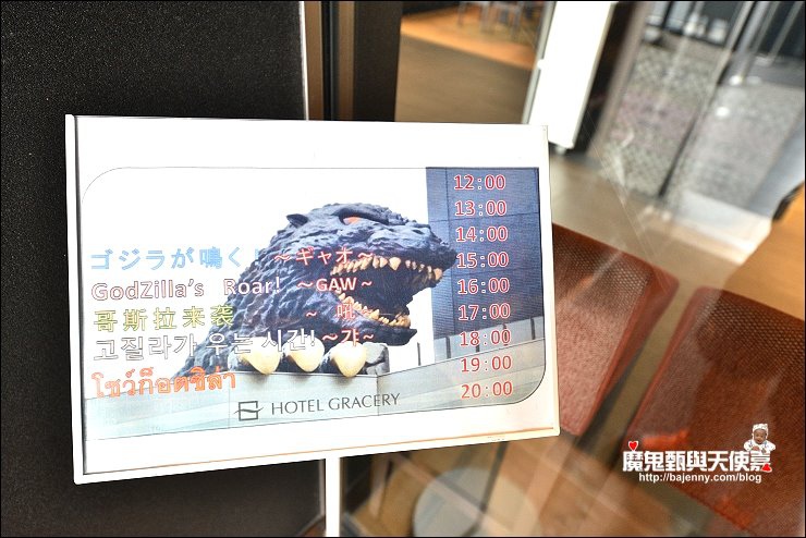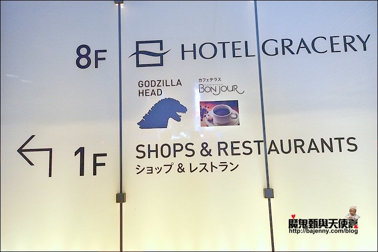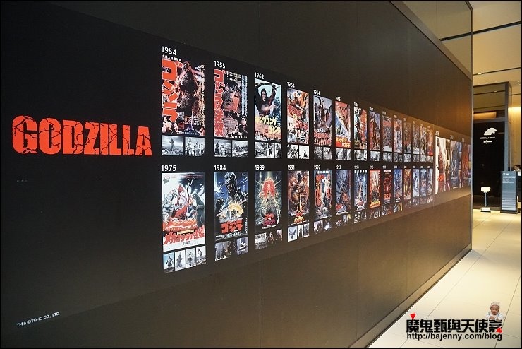 新宿格拉斯飯店的大廳位在八樓,一出電梯轉個彎就看到整面哥吉拉電影紀事,特別查了維斯百科,聽說最早的哥吉拉受到美國《金剛》影響的怪獸電影,描述受到輻射污染的海域中出現一隻身高達50公尺的恐龍型怪獸哥吉拉,哥吉拉後來成為日本類似電影、動畫、漫畫的怪獸原型,對於日本動漫作品的怪獸形象有非常深遠的影響。