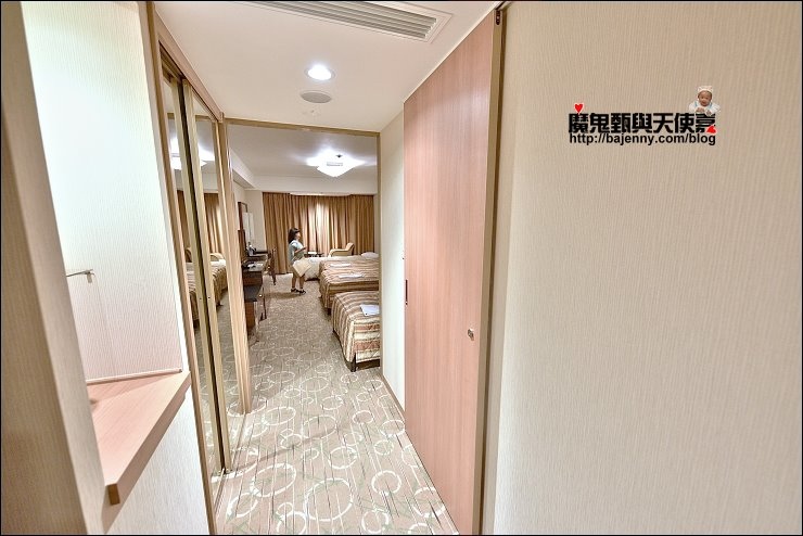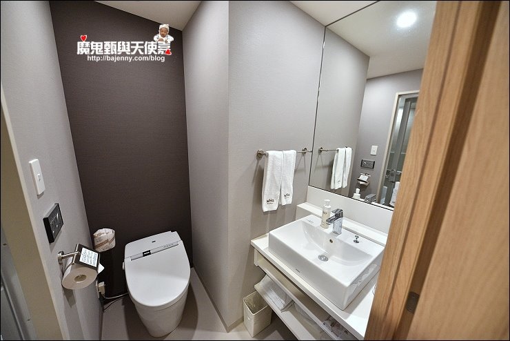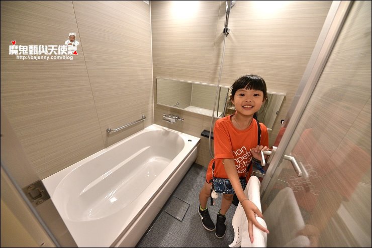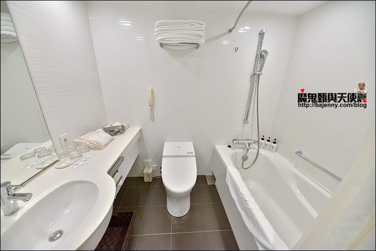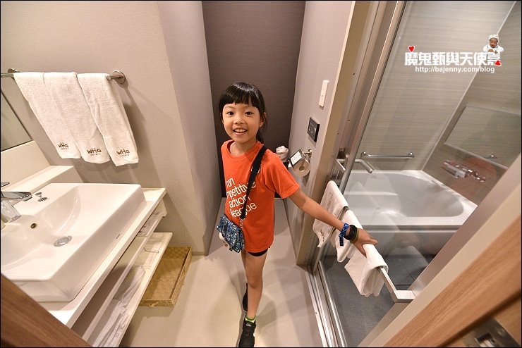 不知為何這家飯店並沒有提供四人入住的家庭房,所以我們只能預訂兩間雙人房分開住,不過這樣也好,我才能好好觀賞世足賽,哈哈!一進門左手邊就是衛浴空間,洗手檯、廁所、淋浴及浴缸分別在不同區域。