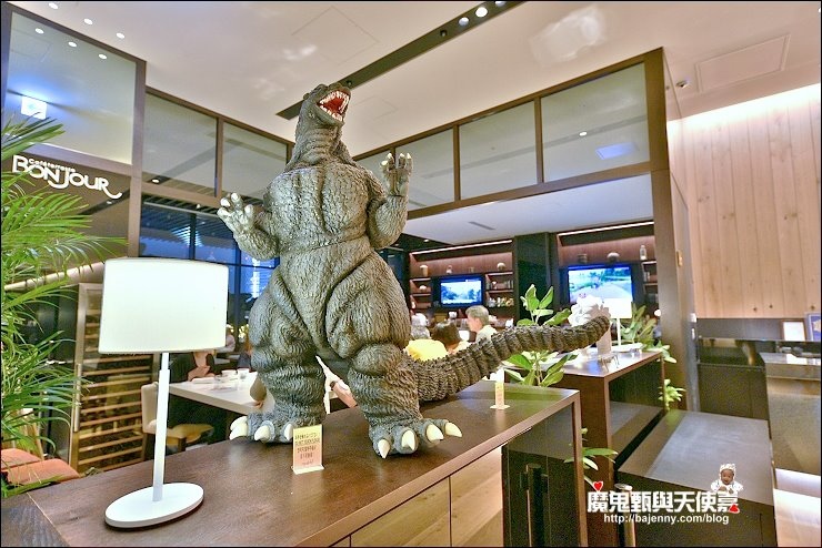 八樓大廳旁用餐的好處就是可以直接望著哥吉拉用餐!!這裡的餐點樣式雖然沒有一樓來的多,但樣樣精緻好吃!我也很推薦!尤其是蛋沙拉、法式吐司及迷你三明治與漢堡都很讚!