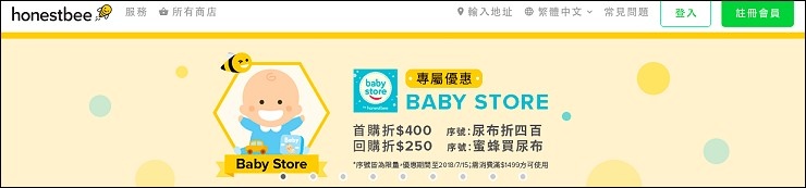除了常買的尿布、奶粉、食品等,也有寶寶護理用品及書籍、學步車及玩具可買,honestbee特別提供Baby Store限定,首購滿$1499現折$400,回購滿$1499現折$250,可使用2次,使用期限至2018/09/30止。(折扣使用限制:折扣金額不可折抵服務費及平台費、首購優惠序號限未使用honestbee任一服務之帳號使用)