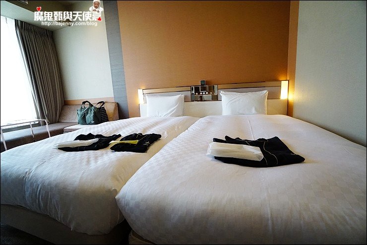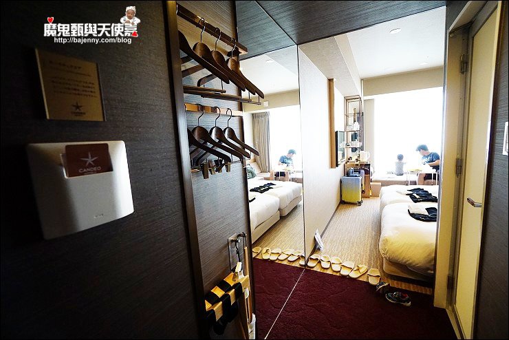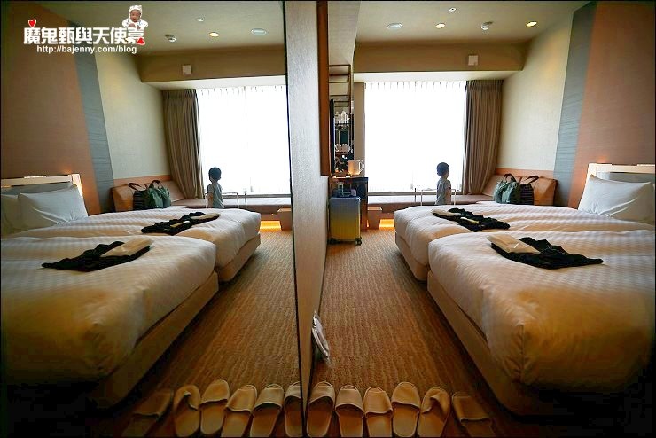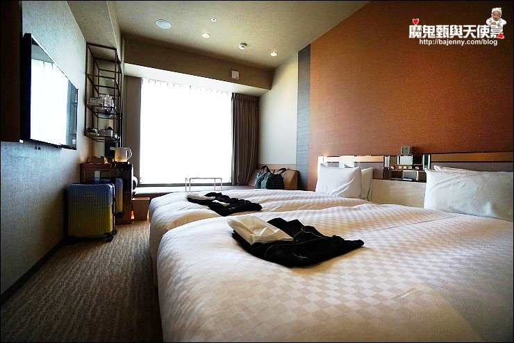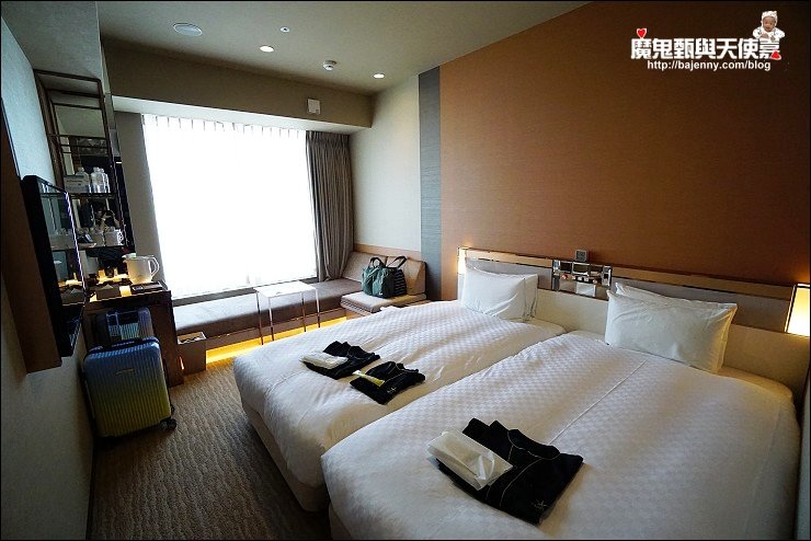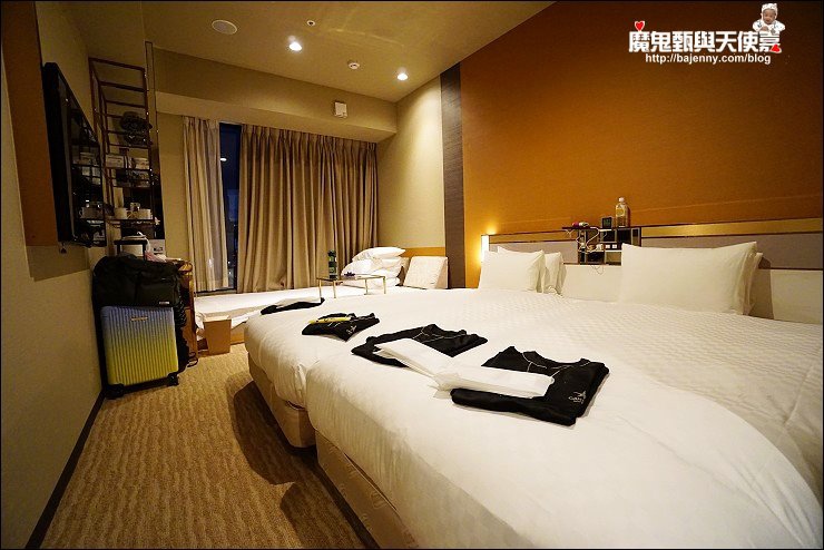 轉角的二床房,門口有一個小空間讓我放娃娃車跟行李箱,沒有佔空間的衣櫃而是以開放式衣架,我們衣服外套直接掛在牆上節省空間,要知道東京六本木寸土寸金,這個雙床房已經算很不錯咧。