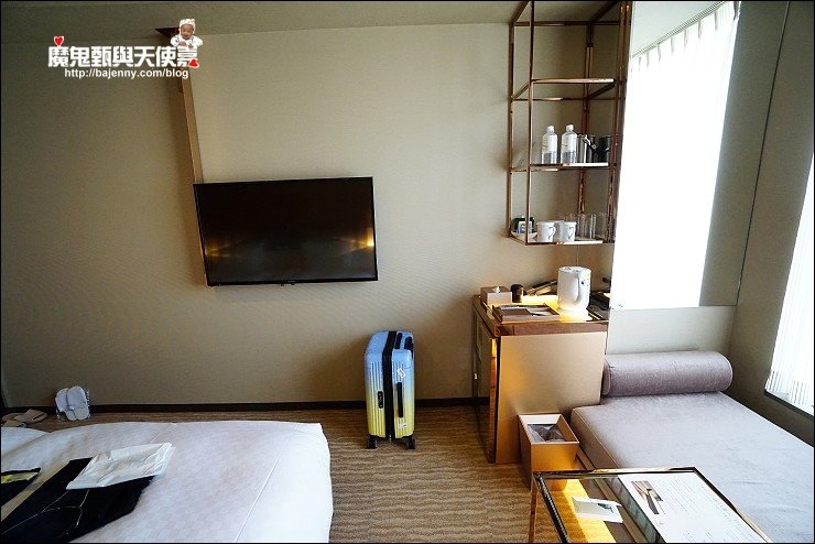 窗戶旁的沙發夠大,小茶几等都是玫瑰金邊,飯店房間整體走精品質感路線。