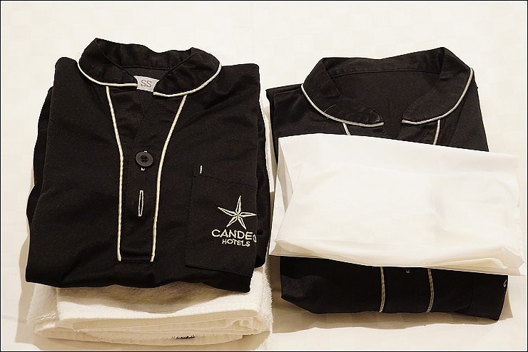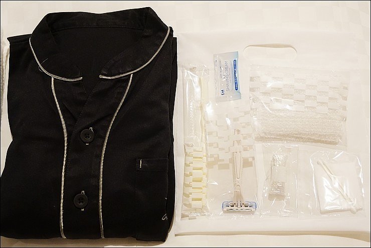 睡衣是上衣加長褲二件式,衛浴備品也用防水袋裝著,帶去頂樓泡湯很方便。