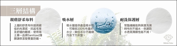 上層-上層的舒柔布料提供絕佳的光澤感、抗起毛球及舒適的睡感,使用瑞士第一品牌Sanitized薄膜讓保潔墊雙重防蟎。