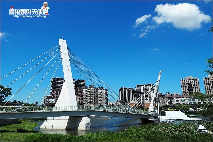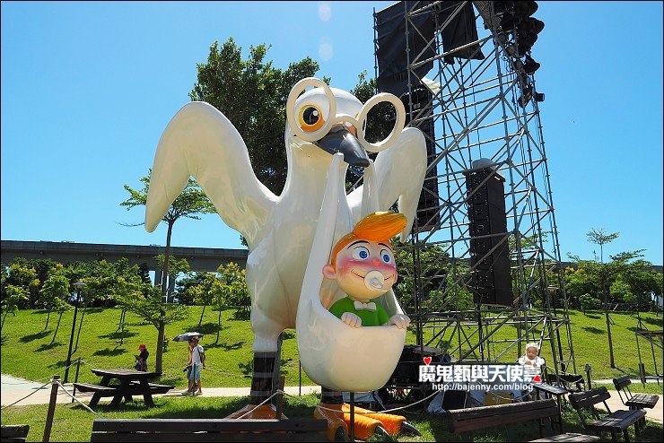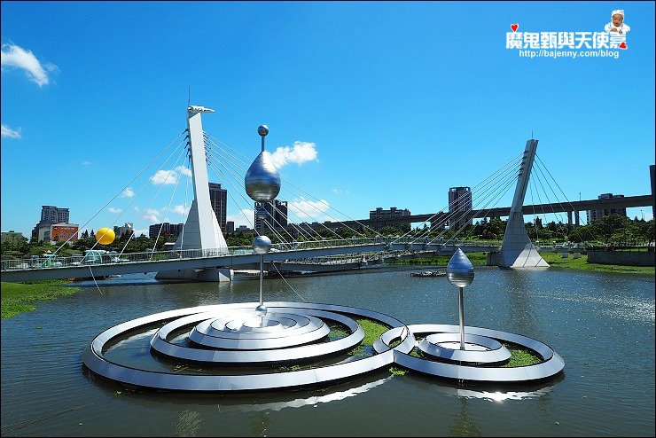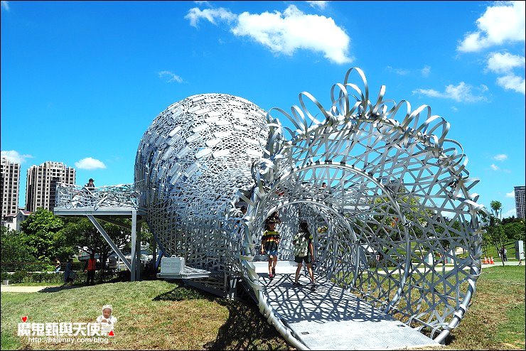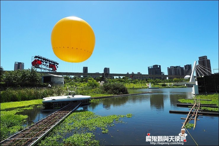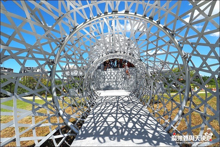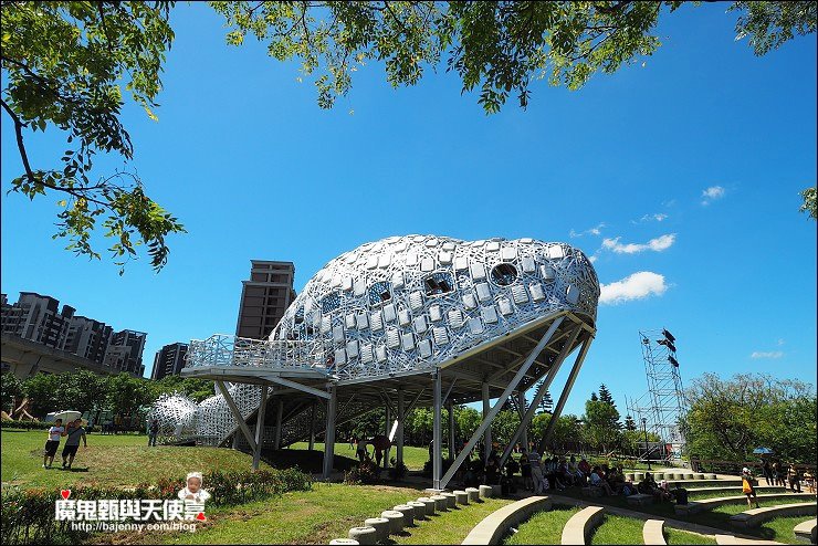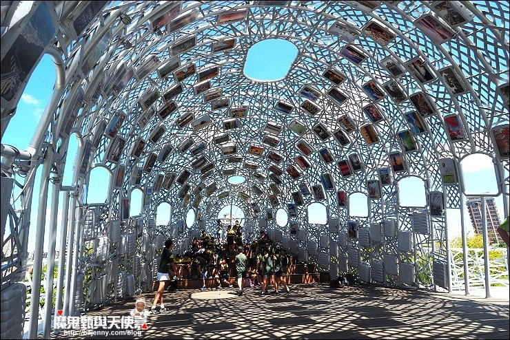以鋼骨建構的飛機一號最厲害,光看外頭我還以為是條鯉魚(抱歉我實在沒什麼藝術細胞),沒想到走進一看才知是飛機機艙造型,一窗一窗的藍天,我也愛撒下來的光影,這裡意外涼爽,我們幾個女生在這裡納涼拍照好痛快,仰頭欣賞藍天與各種風景美照。不過這裡比較沒有遮蔭的地方,建議傍晚來比較涼爽,假日夜間水上劇場表演應該更有看頭!