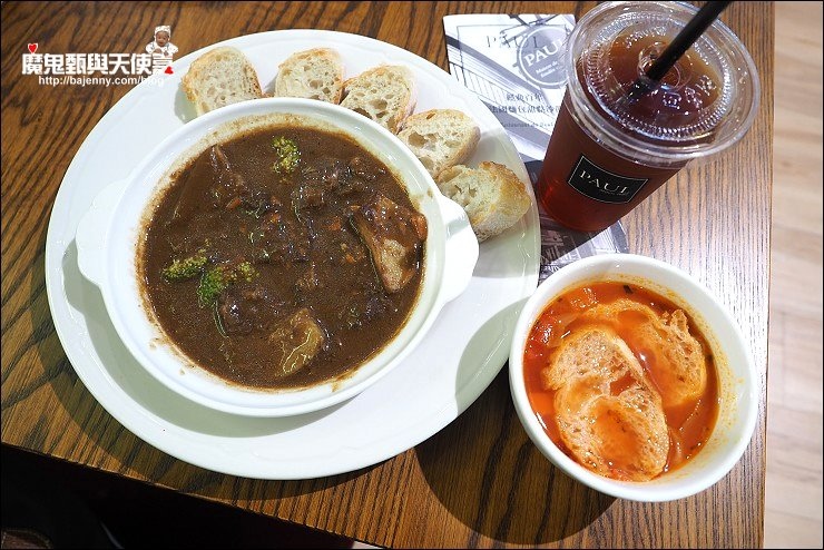紅酒燉牛肉套餐附麵包及紅茶或果汁擇一,牛肉燉的入口即化,醬汁味道也很足,口感Q彈的麵包沾醬吃很耐吃,鮪魚可頌份量對中午想簡單吃的朋友來說也很OK,可頌外皮酥脆,加上新鮮的生菜及多汁的蕃苆片,口感豐富,倒是鮪魚餡好像不計成本放好多,PAUL的麵包讓我跟友人全都再買幾個回家與家人同享,早上起床把吐司切片烤一烤,看是要沾蜂蜜或是果醬,野馬妹一個人吃了半條以上!