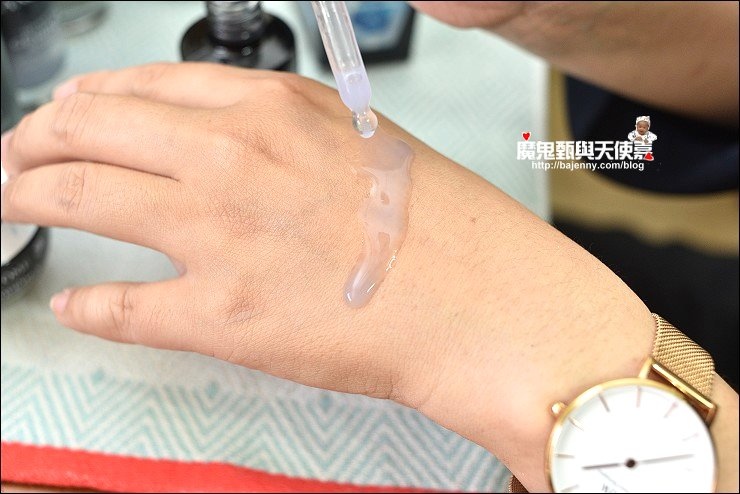 小黑瓶的質地不是濃稠的精華液,而是稀稀的水狀的,顏色帶點乳白色色接近透明,很好吸收,擦在臉上很清爽,即便夏天擦很清爽不黏膩,秋天用也很夠力。滴管式的用量很好抓,櫃姐建議用二管全臉加脖子一起保養,我自己習慣一管半擦全臉再帶到脖子,小臉用量比較省!小黑瓶使用在洗完臉擦完化妝水後,乳液前所使用的修護精華,可以讓後續保養品吸收更好,皮膚保水度好上妝更服貼不容易脫妝。