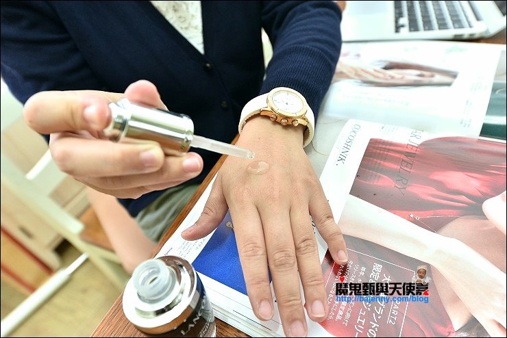 稍微搖晃瓶身將美麗的藍紫色活性配方與精華液混合(記得一定要多搖幾下,讓滴管裡的活性精華全都釋放出來,不要傻傻的一轉開就拔掉,我好朋友就是這樣糊塗,管子裡還好多活性精華沒有釋出就丟掉真是浪費),充份搖勻後再把管子替換成銀色的滴管就大功告成,可以天天使用。