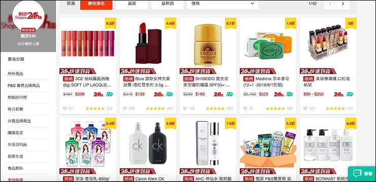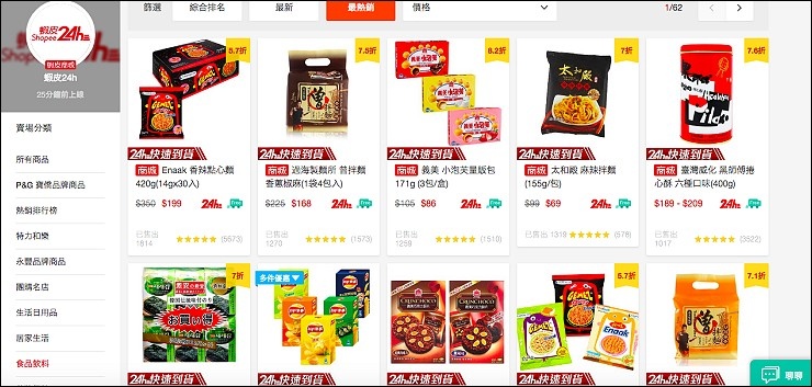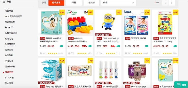 蝦皮商城品項眾多,左邊分類清楚,可以直接看產品類別,像是生活日用品、食品飲料、母嬰用品或3C與週邊商品等等,可以再依綜合排名、最新、最熱銷、或價格去做排序,購物選貨很精準!