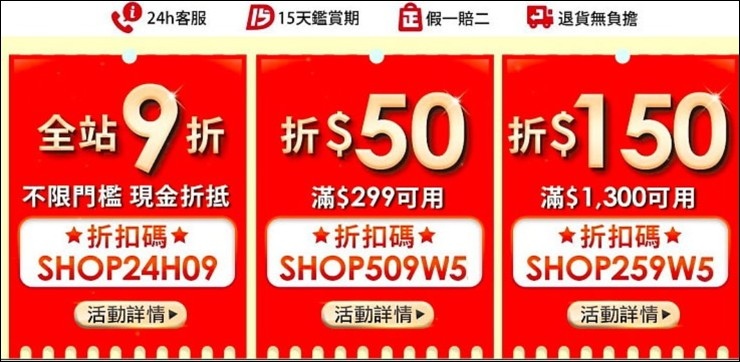 「SHOP24H09」優惠碼,全站九折(最高折三百),使用期間:即日起~9/30