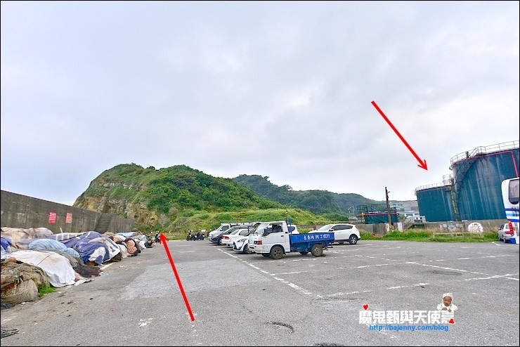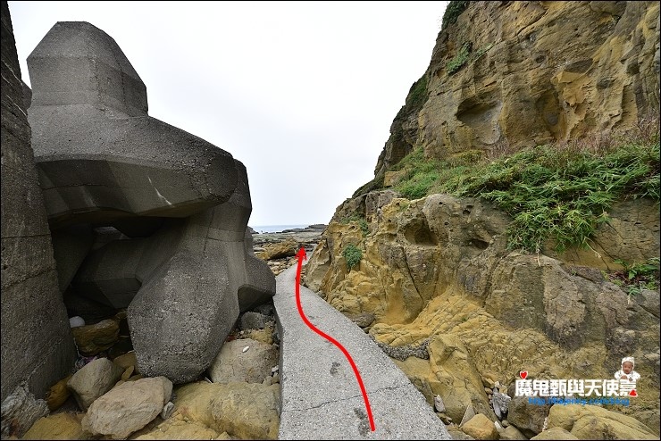 最後這個比野柳女王頭還威的大坪海岸八斗子海豹岩,在新聞強力放送之下,應該很快會跟象鼻岩一樣變成人擠人的熱門打卡景點,不過新聞報導完全沒有海豹岩的交通路線和步行攻略,現在網路的遊記也沒幾篇,目前GOOGLE到最詳細遊記是寶寶溫親子旅行生活,要找到大坪海岸八斗子海豹岩有幾個重點關鍵字:退潮、防滑、大坪海岸、油庫、八斗子漁港和海科館,車子可以直接停到八斗子漁港油庫旁停車場,按照上圖紅色箭頭走進去就會到,記得要退潮時來才看得到,大叔團第一次跑去忘幽谷高地只能遠遠看得到而已。