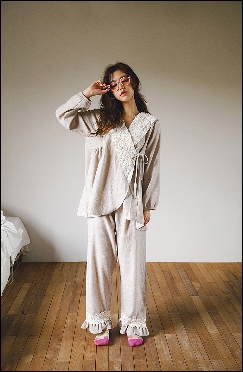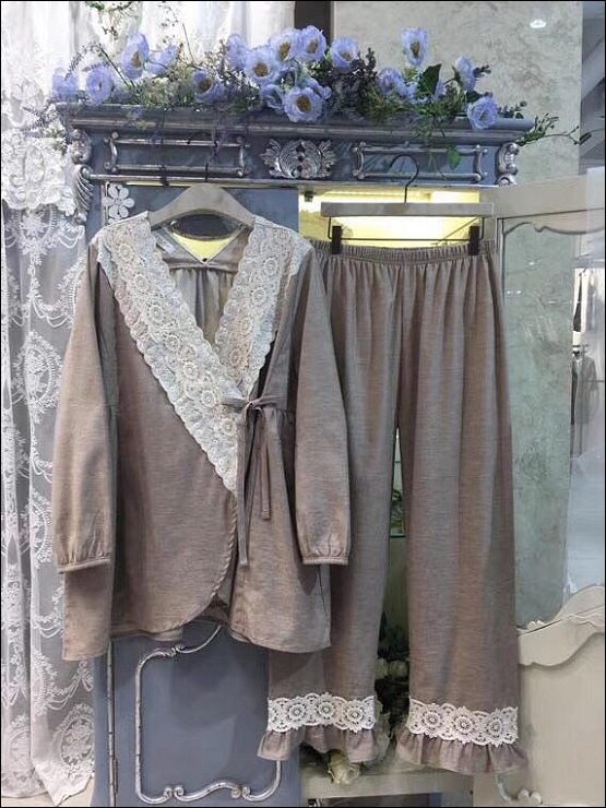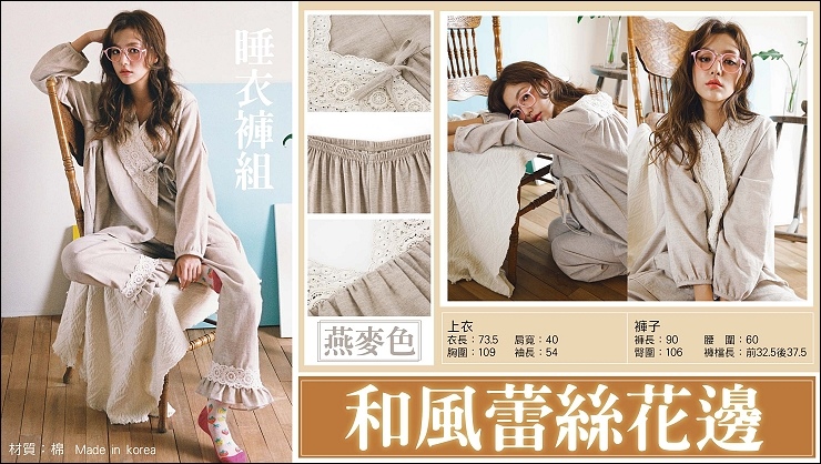 燕麥色衣服跟褲子都是全長,兩款領口的蕾絲也都不一樣喔!倒是兩款都是綁帶設計,穿脫好方便啊,這種還是學生妹、小資女的菜吧~~媽媽們會愛嗎?!