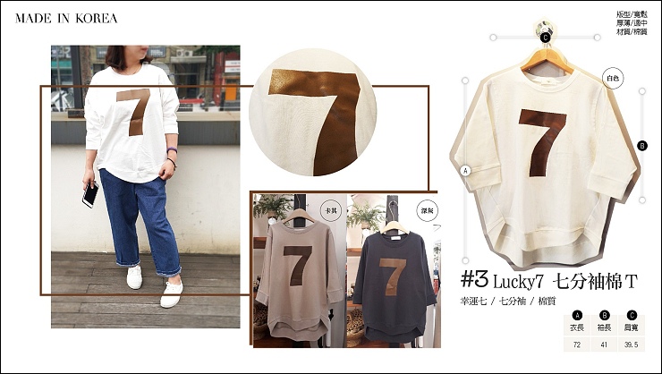 LUCKY 7,這件上衣也是簡單又有型!走率性風,搭牛仔褲整個很優閒~~另外兩色我也很喜歡,但現貨只剩白色有貨,如果想要其他兩色必須湊30件店家才給做喔。