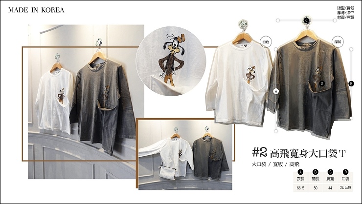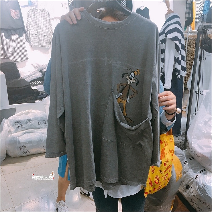 這件高飛狗也是人氣爆款,缺貨啊缺貨,當場都買不到樣品,寬身大口袋的設計剛好露出整隻高飛狗的身影,好可愛啊~~這種T四季皆可穿,春夏秋單穿,冬天裡面加件保暖衣或發熱衣就行了!