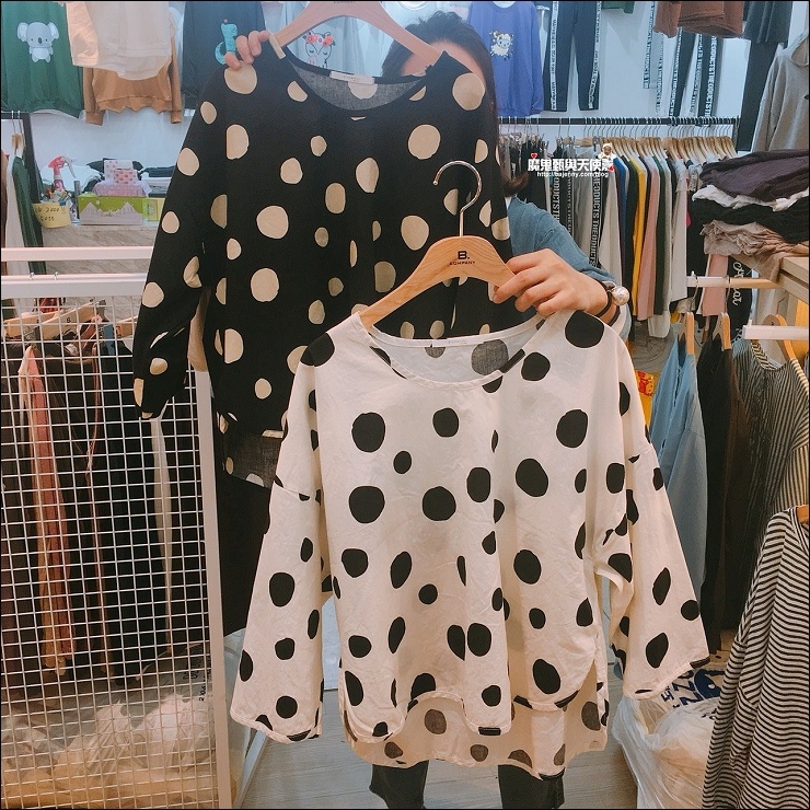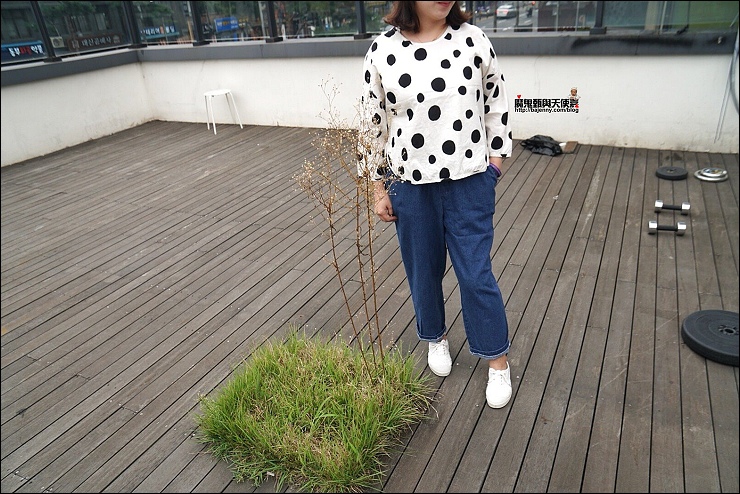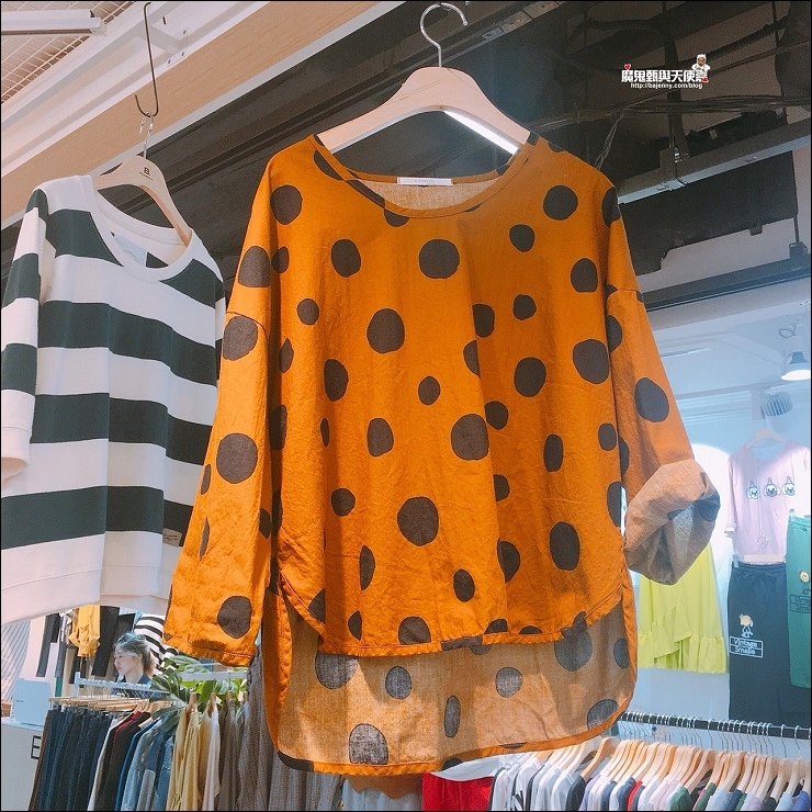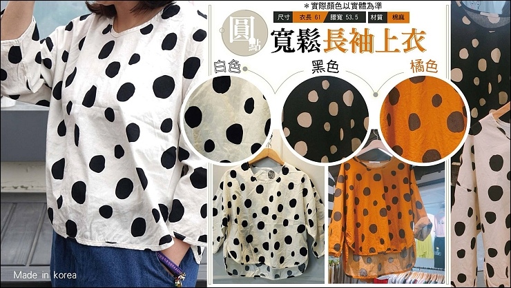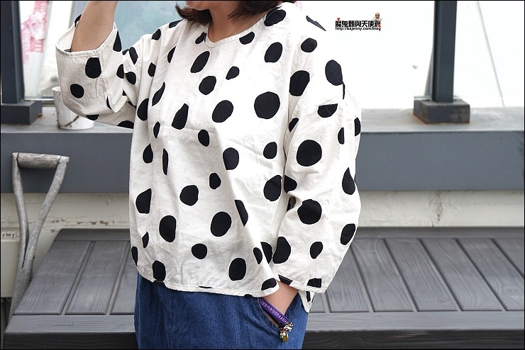 大點點有三色,當天只有白色有貨,我超愛橘色點點,可惜現場沒貨!這件穿上去至少年輕5歲(很顯年輕喔,雖然我覺得他有點乳牛裝的味道,牟~~ ),前短後長的寬鬆剪裁,一樣S~XL都可以駕馭。