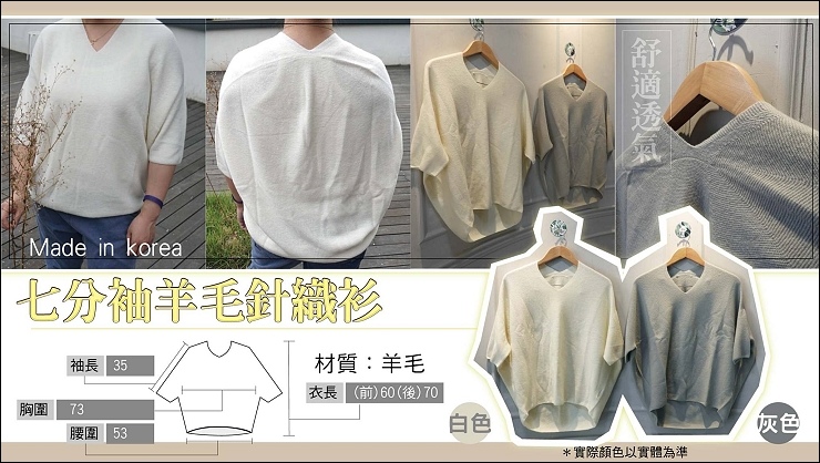 這件七分袖米白羊毛針織衫也是萬年不敗款,因為材質的關係,是本次外出服品項中單價最高者。