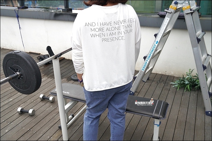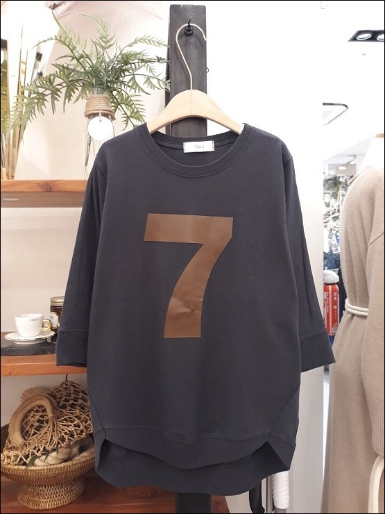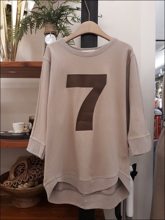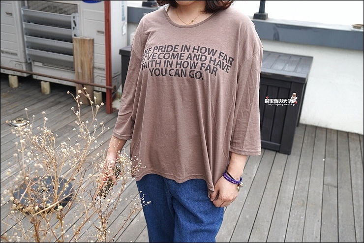 這件上衣也是各種尺寸都能穿!!七分袖微涼的秋天正適合,正面四排簡單的英文字。