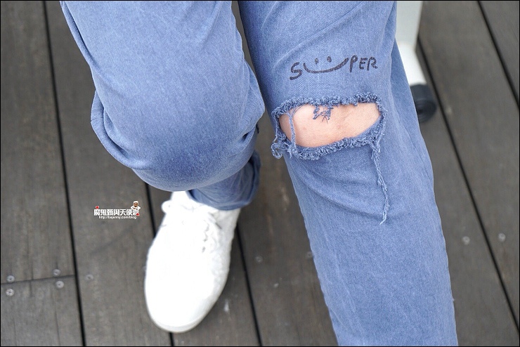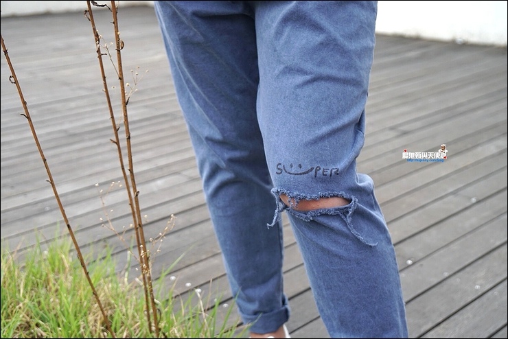 我其實不太喜歡破褲,但這兩年好流行喔(感覺不跟風來個一件就落伍了),這件不算太破,還在可以接受的範圍...而且這件一腳破洞上還有嘴角上揚的微笑(小心機),看了super開心!!