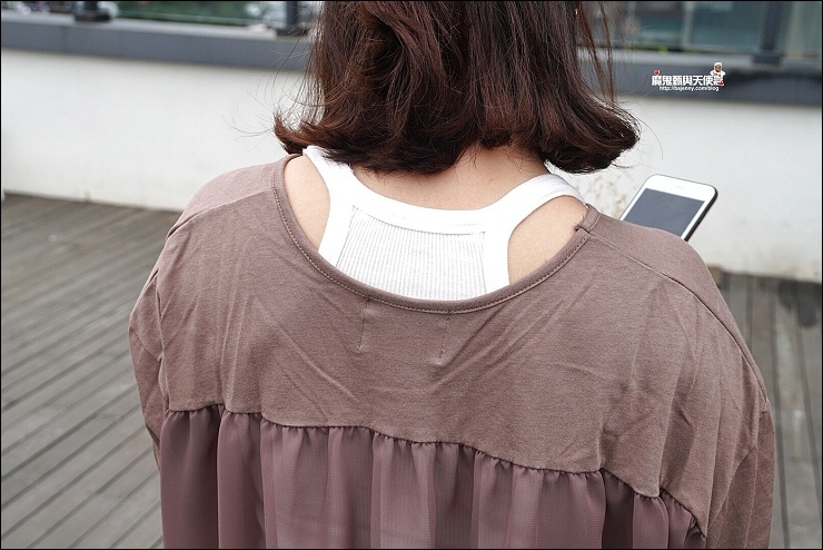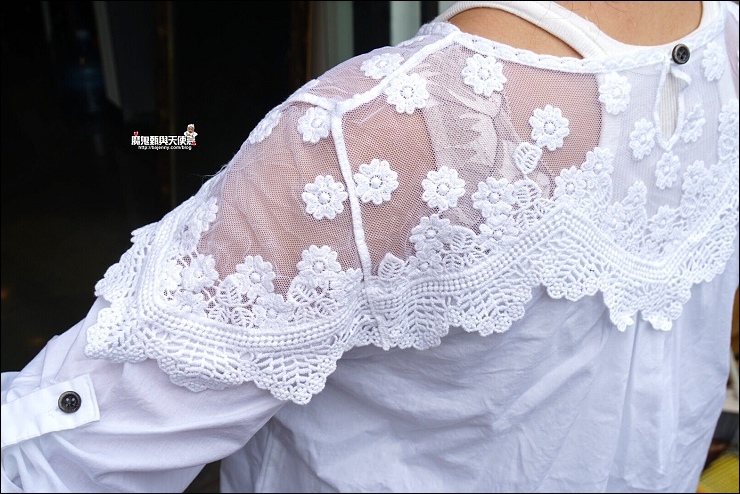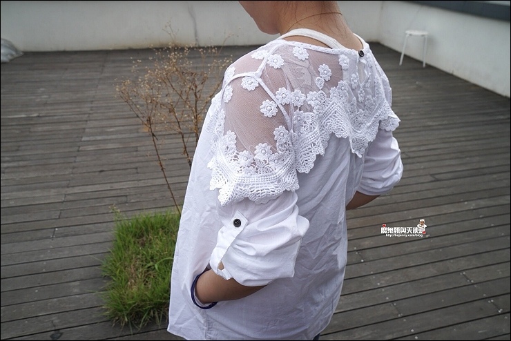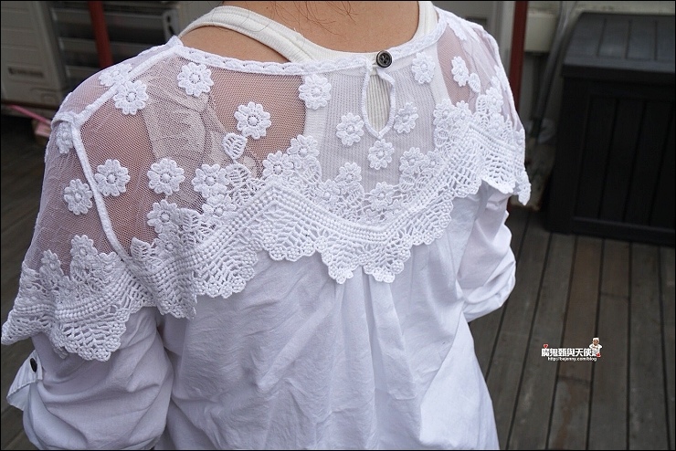 前後都有蕾絲片,而且他的蕾絲是那種很細很舒服的,不會刺刺的,我覺得延伸到袖緣端很好看!