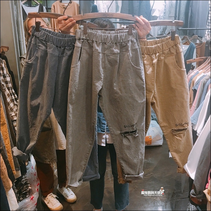 這款Super單邊刷破鬆緊褲在場試穿過的人都說讚!因為看前一個人穿好看,從153~170都去試穿了,正點!共三色,而且每一個顏色都刷的好好看,我自己要包色!