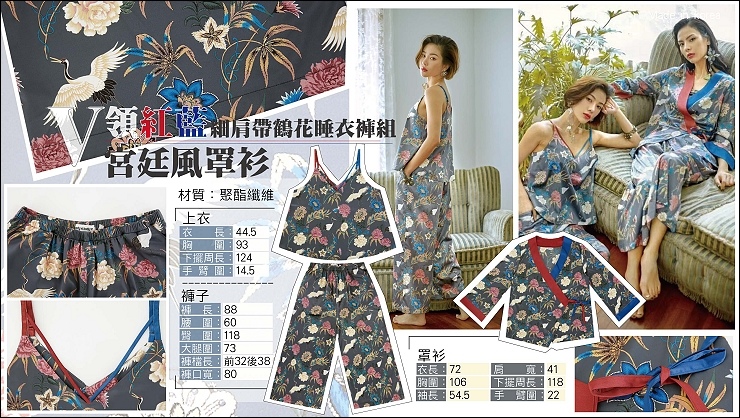這套V領紅藍細肩帶鶴花睡衣褲組超特別,完全走宮廷風,有人還陷在延禧攻略中嗎,趕緊跟風來一套XD,重點是好看又好穿!!胸前的V領紅藍細肩帶真是性感到不行!肩帶也可以調整,穿起來超有型極具個性!身材姣好的媽媽選這套當戰鬥服就對了~~