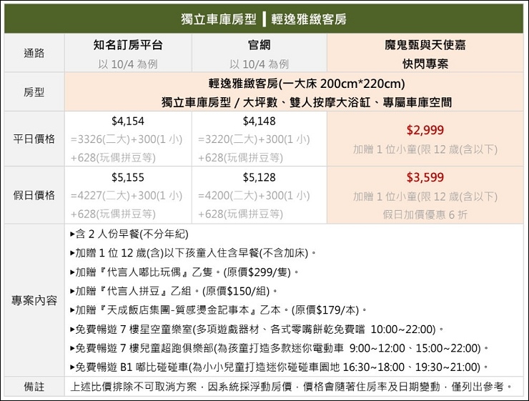 🔥這次的嘉義天成文旅限時快閃團,按照慣例比知名訂房平台、官網專案和旅展還超值!快閃專案共有三種房型,一種是雙人房平日升三人房(變成有浴缸/二大一小優惠),另一種是四人房(四大/大童也適用),最後一種是輕逸雅緻客房(車庫房),上一團最熱門的輕逸雅緻客房,有獨立車庫及通道,直上房間,而房間跟浴缸也都是超級大的,可以跑來跑去的那種,另外今年還有新的設施,兒童超跑俱樂部給孩童的迷你電動車,另一個是給小小兒童打造迷你碰碰車,有興趣的團員可以趁快閃搶便宜,省下來的錢可以多吃幾餐嘉義雞肉飯或夜市小吃!
