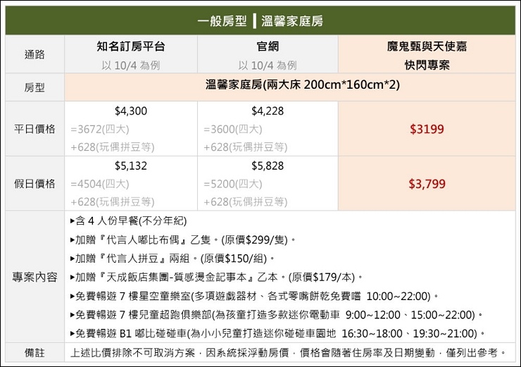 平日(週日~五)每日限量免費升等親子三人房(定價$9,020)/最多5間(依房況為主)。