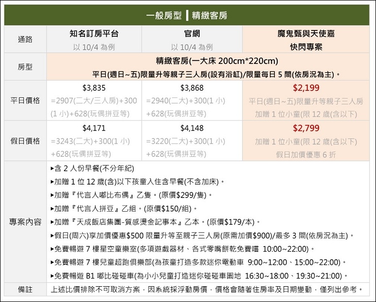 精緻客房、輕逸雅緻客房專案皆已加贈一位小童(12歲(含)以下),