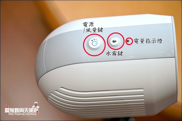 使用上很簡單,主要是上面兩個鍵,最左邊是電源跟風量鍵,風量聲音依照不同段數約在15分貝到40分貝之間,一打開是最小風量,再點一次變二段、再一次三段、第四次就是最強風量!在室內空間時一跟二段聲音幾乎沒有,但第三跟第四段就聽得到聲音了!如果在戶外應該都聽不到XD