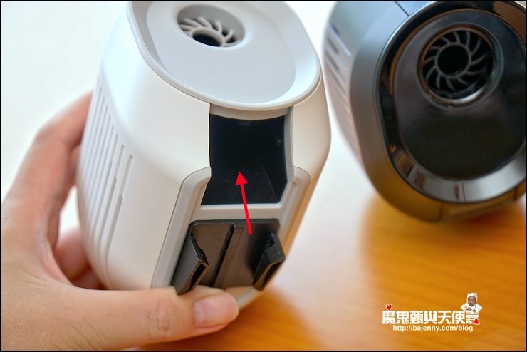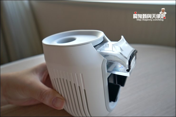 水箱有設計提把很好拉出來,倒是之後如果要抽換棉條比較需要技巧(有角度),是說經過這兩次的合作,發現年輕團隊真的很有活力,修正速度非常之快,水箱也是經過一再改版,新材質水箱可耐精油、耐腐蝕,大家一定很關心電力可以使用多久,在充飽電的情況下,若同時全速運轉清淨與水霧功能,可連續使用4小時以上,若只使用清淨功能,則可連續使用10小時以上!