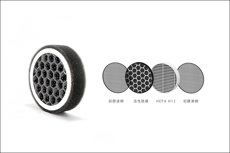 我收到的樣品濾網還只有三層濾網,廠商後來又改良進化為四層濾網(官網資料開團前來不及更改)!!初篩濾網可以擋掉較大顆粒的沙塵、毛髮、小蟲等物體,第二層活性碳可中和、去除HEPA無法過濾的有害氣體與氣味分子,例如甲醛、CO、硫氧化物、氮氧化物與菸臭味…等等,第三層頂級H12 HEPA濾網可達到HEPA12等級,過濾效率為99.5%以上!確保送出的空氣極致純淨。當濾網需要更換的時候電量指示燈會亮起,使用者不用記任何日期,系統會自動提醒更換時機,讓HEPA在真的該換時才丟棄,避免不必要的浪費。