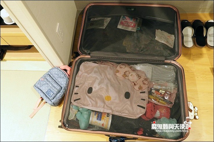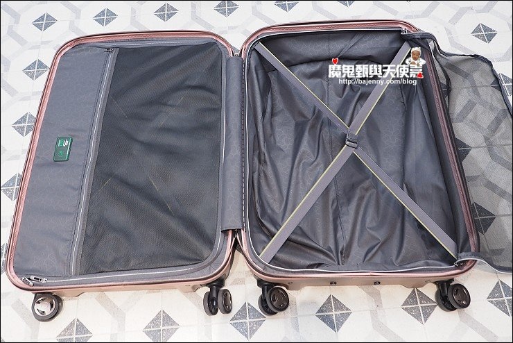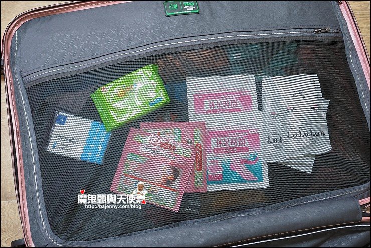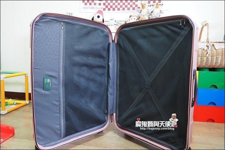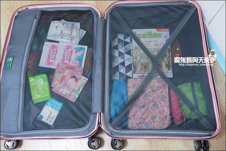 行李箱我最怕沒網子,打開或蓋上時很怕東西會掉落,裡頭的物品也容易走位...至少要有一邊有網子拉起來才行,這咖行李箱雙層對開,二邊都有X型伸縮繩固定,也都有半透明網子,東西收納整齊又好找,對於我這個很愛買又很會亂塞的懶媽媽來說很好用,不怕行李箱打開,小東西也跟著掉滿地。