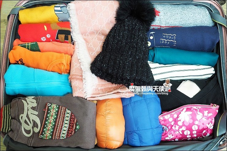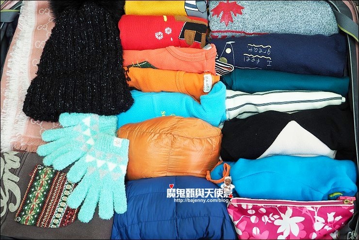 收納我習慣衣服用捲的,一來很好找,二來也比較節省空間,第三點是衣服比較不容易皺巴巴,當然有些會使用網狀收納袋來分門別類整齊有條理更好。基本上出國要帶的我會盡量精簡,但帶小孩出門就省不得,小孩的衣服一定要帶足,夏天室內外溫差大,只要一流汗,隨時都得準備換衣服,免得一進室內被冷氣一吹就受風寒,這次帶阿弟到冷冷的北海道,更是怕他冷到,發熱衣備了好幾件,背心、羽絨外套更是不能少,保暖的圍巾、帽子、手套、口罩都要備齊。