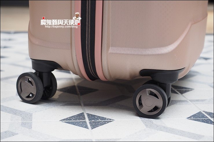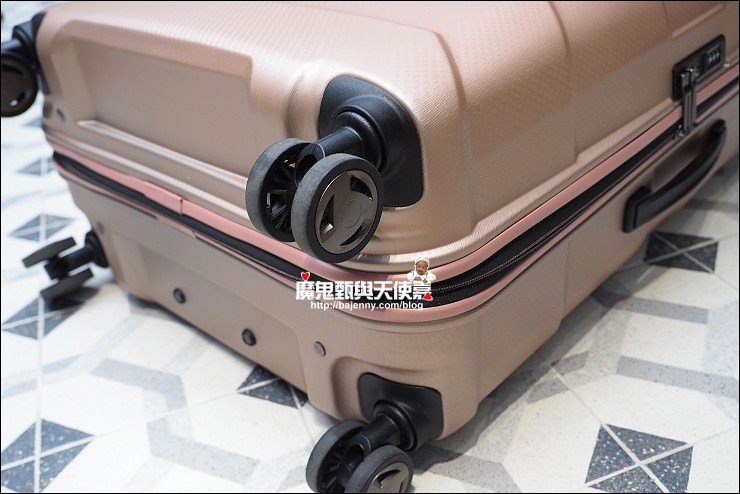 行李箱的輪子超重要,好幾次出國都在路上看到行李箱輪子剝落或掉下來,四輪缺了一角行李箱就像跛腳那樣,非常難推,拖起來很狼狽,一要拖著行李移動就會很抓狂...此款行李箱是四顆360度全方位轉的飛機輪,耐磨好推,推行時很滑順,就算裡頭裝滿滿也很順。
