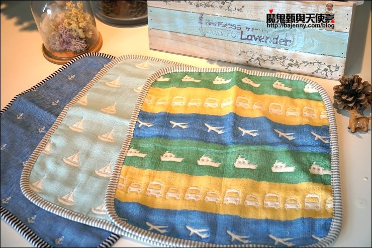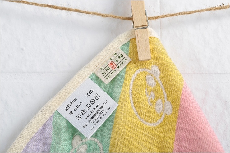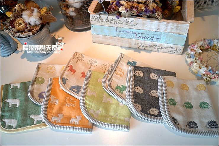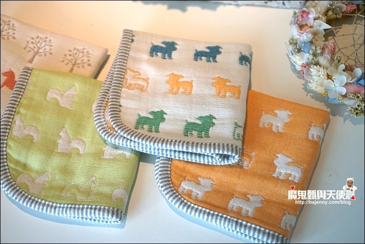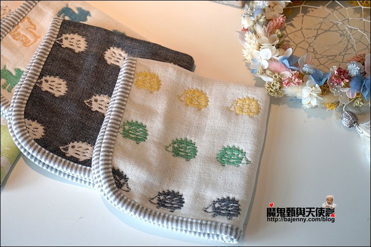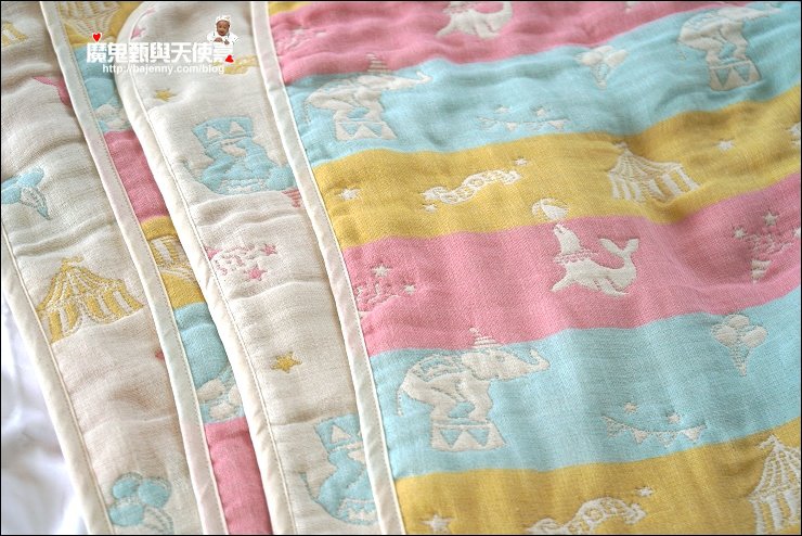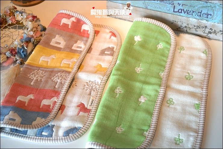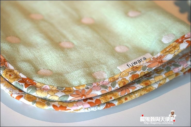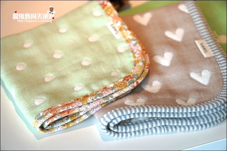 其實兩面都可以用,露出的標籤是正港三河木綿好像也不錯,而且很多小孩很喜歡摸抓標籤的手感刺激,好像還能有這個功用XD,廠商還分享有客人的小孩拿去當洋娃娃的包巾,大小嘟嘟好:P,是說假娃娃不用用到六重紗啦,隨便包一包就好...