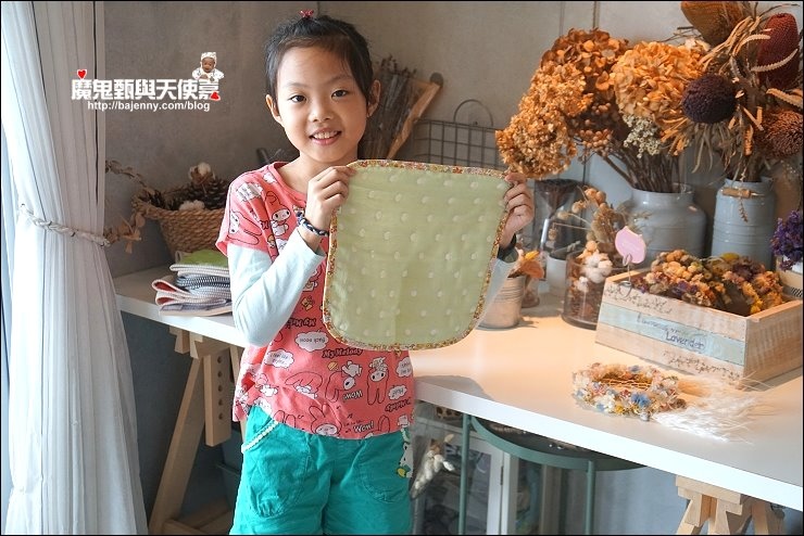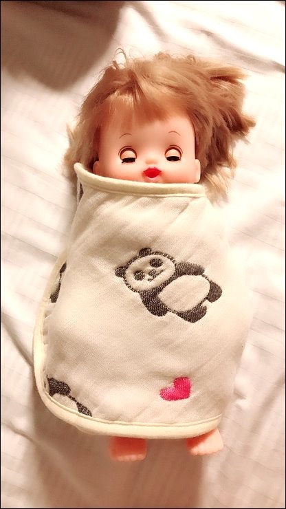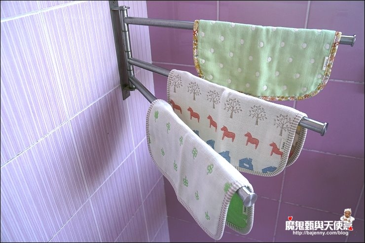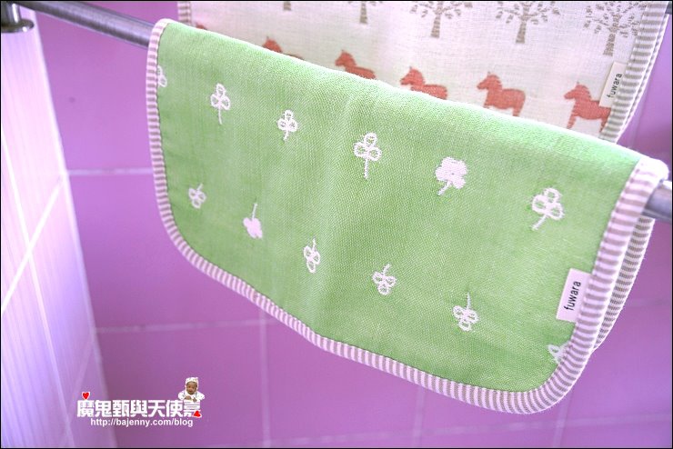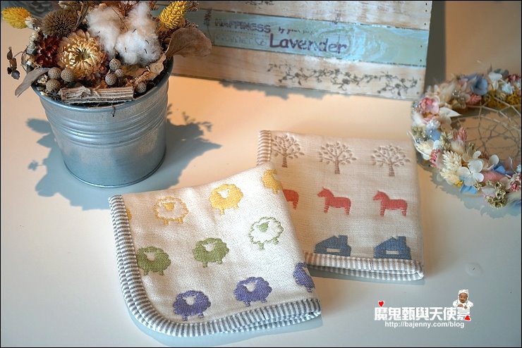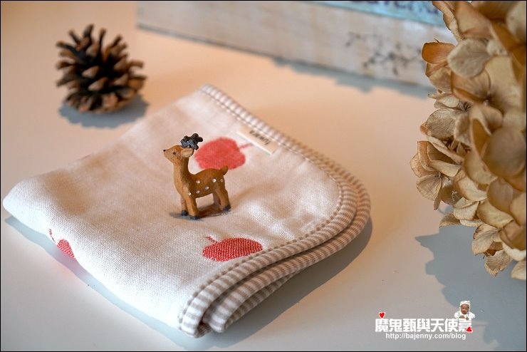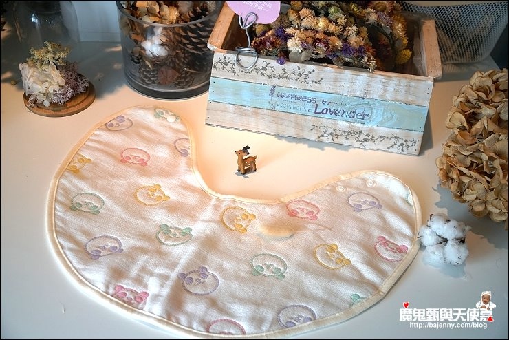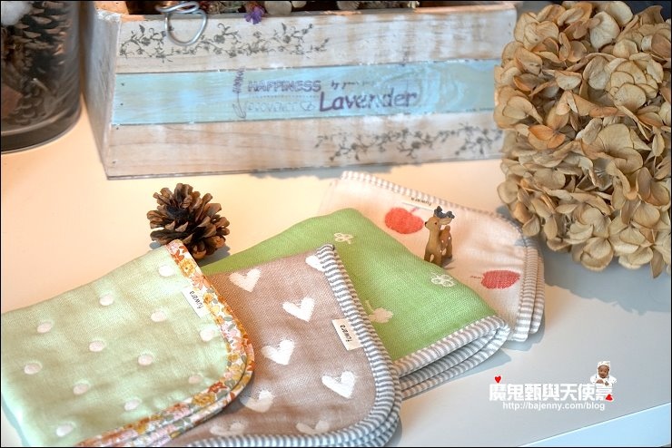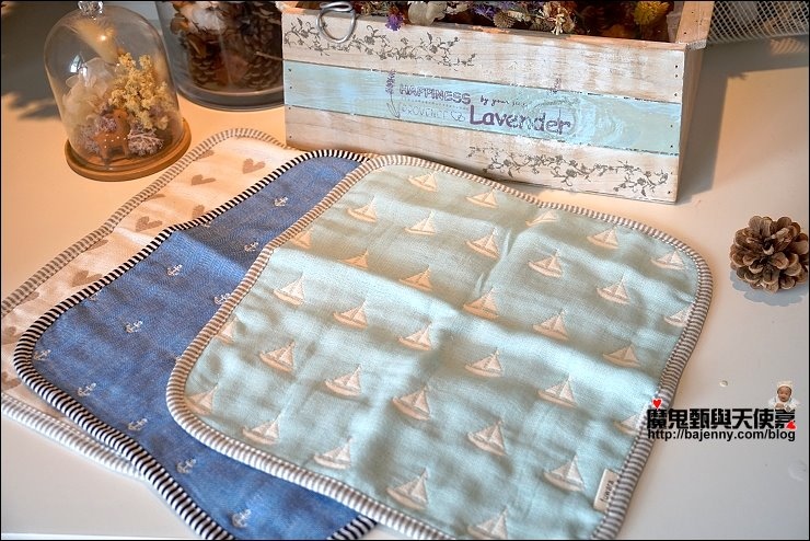 其實兩面都可以用,露出的標籤是正港三河木綿好像也不錯,而且很多小孩很喜歡摸抓標籤的手感刺激,好像還能有這個功用XD,廠商還分享有客人的小孩拿去當洋娃娃的包巾,大小嘟嘟好:P,是說假娃娃不用用到六重紗啦,隨便包一包就好...