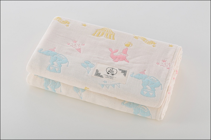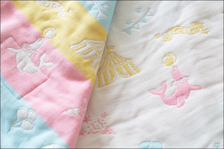 第一款是日本設計師幫特別改良的夢想樂園馬戲團,在織的線條上很驚艷,比起之前簡單的圖形來說這次的細節很多,據說打樣了好多次才完成!大象身上的線條還有馬戲團的帳篷很精美,雖然線條多但摸起來一點都不粗糙,一樣柔軟~這個配色上也特別使用疊色的設計,大家可以看一下,像水藍大象搭著粉紅帽子、桃粉海豹上頂的球是黃色的,整體來說色彩的使用編排真的非常高竿~