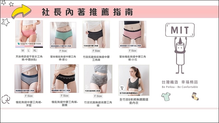 上面那幾款社長全都試穿過一輪,他們家的內褲基本上中低高腰全包了,還有出針對上健身房或練瑜珈等運動可以穿的機能無縫三角褲(比較不會移位的款式)。