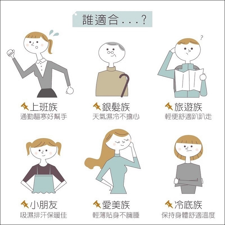 媽媽們的選擇多很多(畢竟我們有搭配需求),雖說是內搭但為顧及個人造型風格,還是要注意配色及款式,共有薄款背心(2019最新款)/圓領/高領及加厚款圓領(天絲抑菌)/EKS五種,EKS這款連下半身都照顧到了,有同系列的發熱褲可以搭配,這根本是設計來拯救冷底族的吧:P