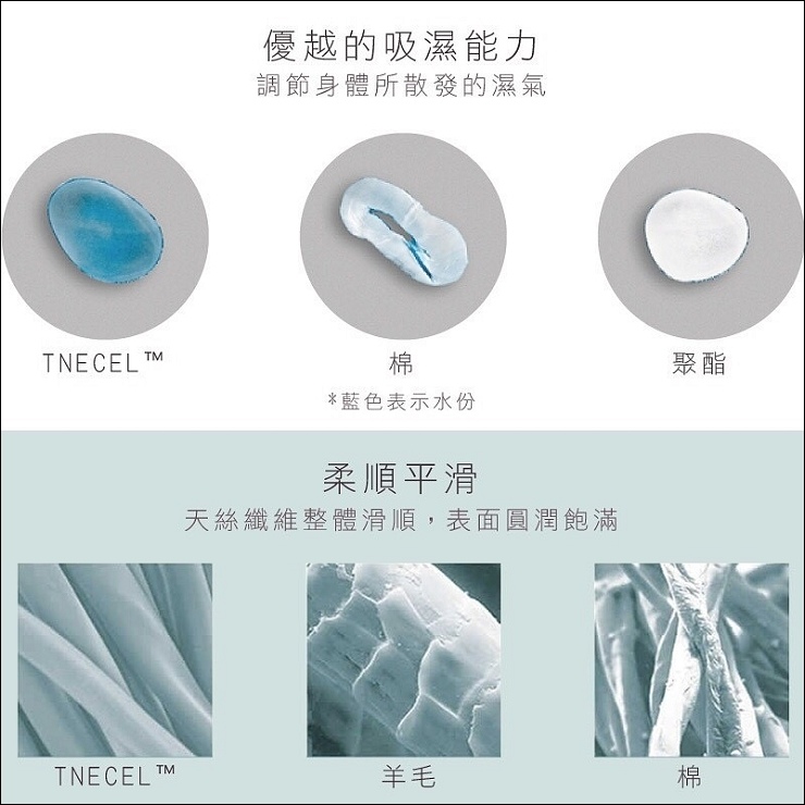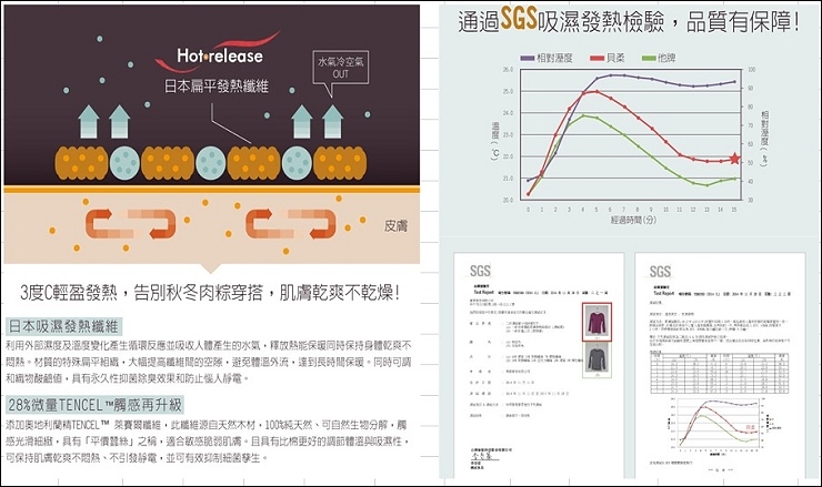 我不想講太深的道理,因為我自己也不想聽,噗,簡單來說就是這種機能布料產生的特性,遇濕或遇冷會調節,再加上新一代加入的天絲材質具有比棉更好的調節體溫與吸濕性,可保持肌膚乾爽不悶熱、不引發靜電,不然每次去日本脫衣服都會電到自己XD