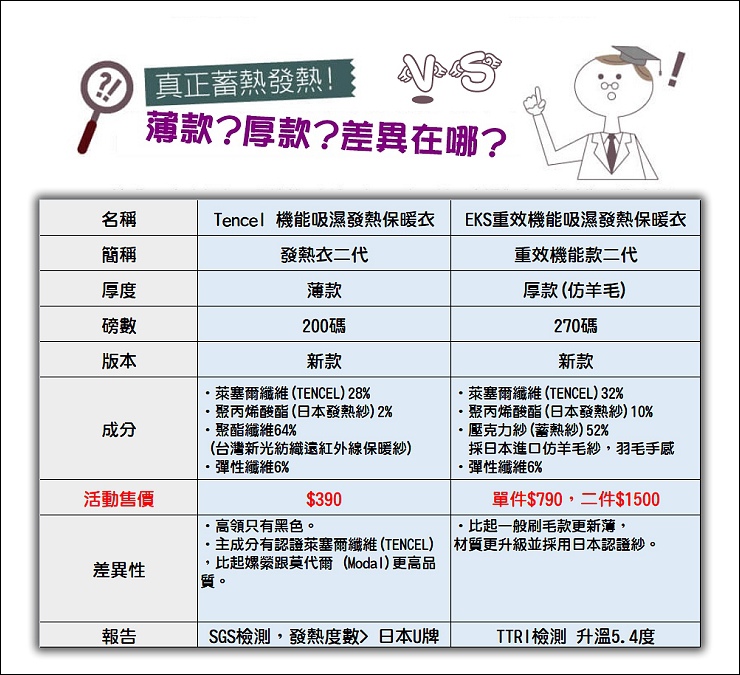 本團發熱衣主要共四種版本,簡單來說,就是Eks的發熱係數最高(10%)