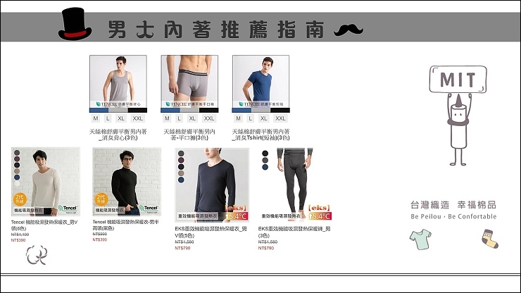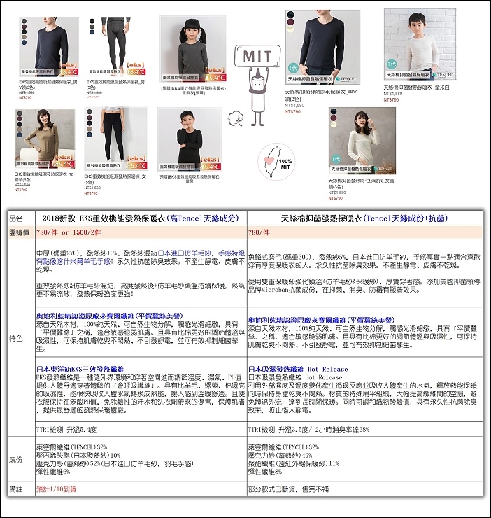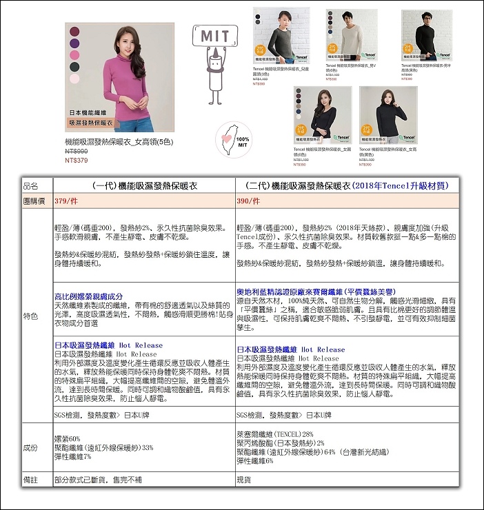今年真的冷超快的!連社長騎機車出門都覺得冷~~所以只好請發熱衣提前上場了XD,棉花糖小肉感的這次也有貼心的2L顯瘦黑可選擇喔!其中背心款式春秋冬三季作內搭都適合,大推!!這次開的素色發熱衣非但台灣製,還是天絲升級版!學生制服裡面再穿這個就很ok了!允嘉哥指定要一年四季可穿的短袖天絲抗菌除臭內衣就好,看來小時候有吃補有差XD,據說市面上的發熱衣幾乎都是陸製的纖維成分,貝柔TENCL天絲發熱衣(有蘭精公司核發的認證吊牌)採用日本Hot Releasa發熱紗纖維(也有認證吊牌),廠商提供的數據報告與日本國民U牌相比吸濕發熱效果更優,這種東西就是要張羅全家大小的份,小姑婆婆娘家媽媽都回報好穿!小姑評價:『雖然滿薄的但有暖,料子也蠻細的』;我自己也覺得材質有舒服透氣(我穿得住),彈性也好!另外還有加厚版的發熱衣,是更高成份的天絲比例之外,採用日本東洋紡織的EKS纖維(也有認證吊牌),有效報告顯示可以升溫5.4度,去寒帶國家或很怕冷的長輩很適合(這系列還有褲子可搭)。但其實這家廠商年度銷售第一是內褲喔!!他們家的內褲基本上中低高腰全包了!還有出針對上健身房或練瑜珈等運動可以穿的機能無縫三角褲(比較不會移位的款式),我最吃驚的是好幾款不分尺寸彈性之大,連超級胖胖的巨大屁屁也毫不費力塞得下(到底怎麼辦到的)!社長推天絲及竹碳款,天絲的無感好舒服,竹碳的彈性佳包覆夠!天絲款內褲連兒童系列都有,可惜這次天絲內褲正在改版當中,還要等一陣子才能上架,大家先補其他的喔~~