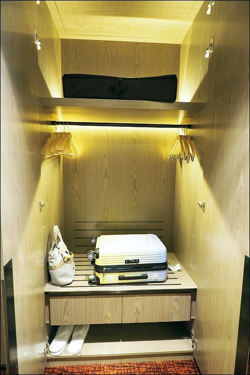 衣櫥設計可以放行李箱,我喜歡把行李箱放上來,拿東西跟整理行李不用蹲在地上、另外一邊也有掛著浴袍。