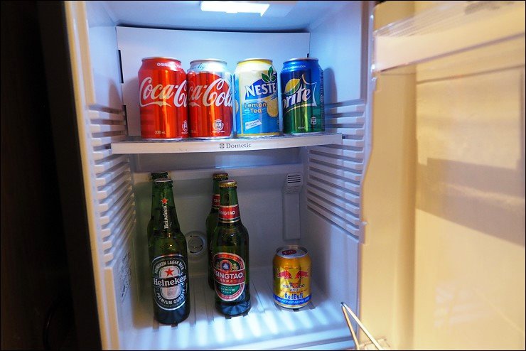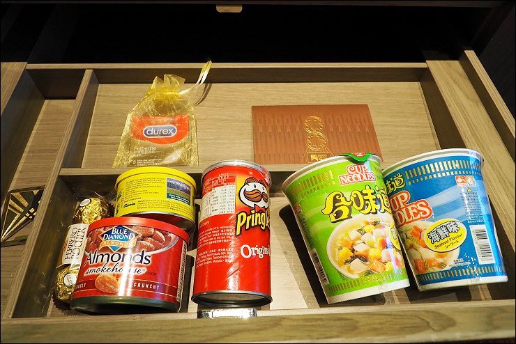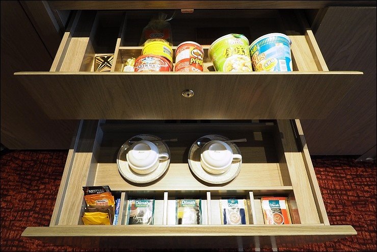 房裡的吧檯區很大,有杯子跟四瓶水免費喝,吧檯下方的抽屜有茶包、咖啡包可免費泡來喝,但零食、泡麵及mini bar冰箱飲料,都要額外付費,退房時清點後再付費。